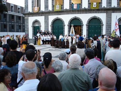 Após o desembarque e cortejo, houve uma breve invocação à Senhora das Angústias, padroeira da ilha do Faial, e primeira imagem religiosa a chegar a esta ilha, pela "mão" de Dona Brites de Macedo. Foi proferida pelo Monsenhor Júlio da Rosa, que também recebeu em suas mãos a réplica trazida pelos "povoadores".